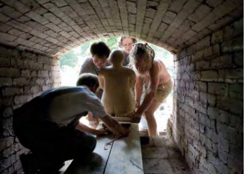 Loading a figure in the anagama, from left, Jimmy Griffin, Ryo Brown-McClain, Joy Brown and Bill Fischer. Photograph: Richard Wanderman